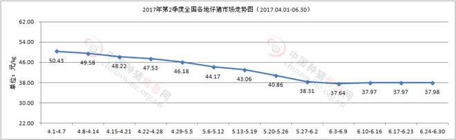 图1 2017年第2季度全国各地仔猪市场走势图(2017.04.01-06.30)