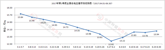 图3 2017年第2季度全国各地生猪市场走势图(2017.04.01-06.30)