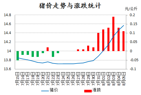自7月31日开始近一周以来,生猪价格单日涨幅超0.1元/公斤,已经连续上涨10日,涨幅达0.85元/公斤,已经超过了前期预计的0.77元/公斤。今天全国外三元生猪价格14.57元/公斤,较昨日涨0.11元/公斤,上涨幅度有明显减弱的迹象。