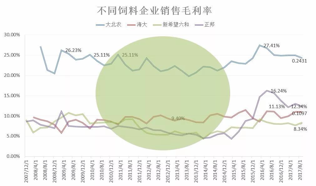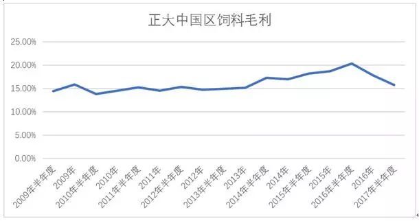 再来看正大,2009-2017年,除了2016年-2017年因为饲料原料价格下跌而下调了饲料价格导致毛利下降之外,2009-2015年,正大饲料毛利一直都是增长的。