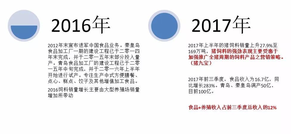 2016年各大企业要转型食品的时候,2012年正大提出了转型战略,经过4-5年的筹备,2015年底、2016年试产,2017年前三季度,食品+养殖的收入,就占正大在中国总收入的12%。