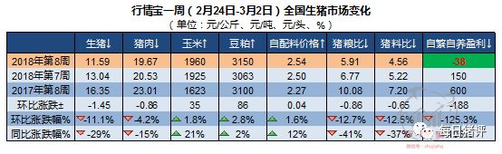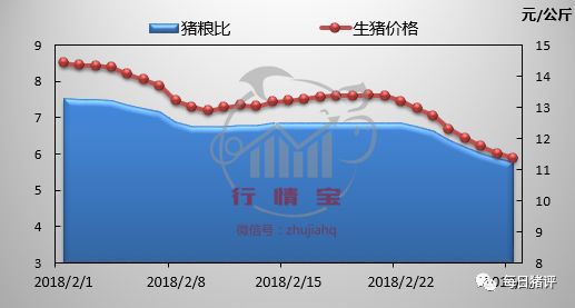 从2月份最后一周的数据变化来看,豆粕玉米价格在2月份持续上涨,使猪价下跌的同时,生猪养殖成本也有所增加,猪粮比已经滑落至5.9:1。2月份最后一周,全国外三元生猪自繁自养头均养殖盈利已经由正转负,生猪养殖业已转入亏损。