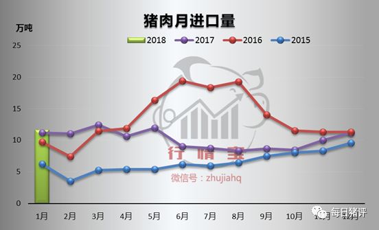 行情宝跟踪海关数据显示,2018年1月份中国冷冻猪肉进口数据显示11.64万吨左右,环比增加4.41%,同比增加4.07%。