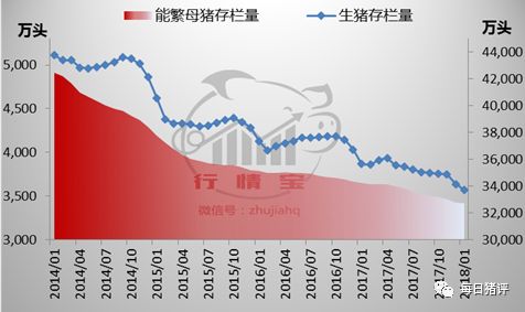 农业部数据,2018年1月能繁母猪存栏量环比下跌0.3%,同比下跌4.9%。行情宝根据数据推算,截至2018年1月底,能繁母猪存栏量缩减约252万头,占年初存栏的7%。