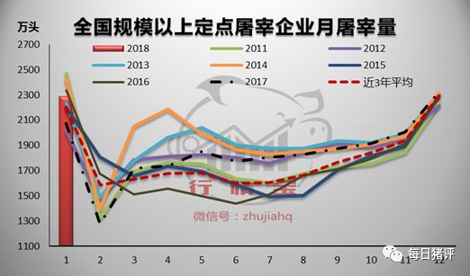 行情宝跟踪数据显示,2018年1月份全国规模以上生猪定点屠宰企业屠宰量为2289.21万头,环比2017年12月份微降1.52%,同比增加10.3%。