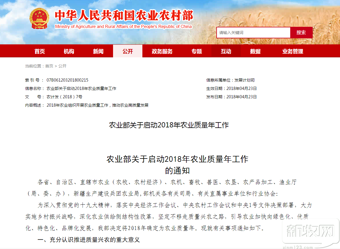 农业部关于启动2018年农业质量年工作的通知