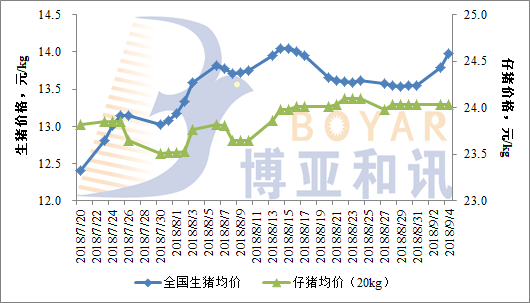 据博亚和讯监测,2018年9月4日全国外三元生猪均价为13.97元/kg,较昨日上涨0.18元/kg;仔猪均价为24.03元/kg,较昨日持平;今日白条肉均价18475元/kg,较昨日上涨0.19元/kg。今日猪料比价为5.14:1,较昨日增加0.07。