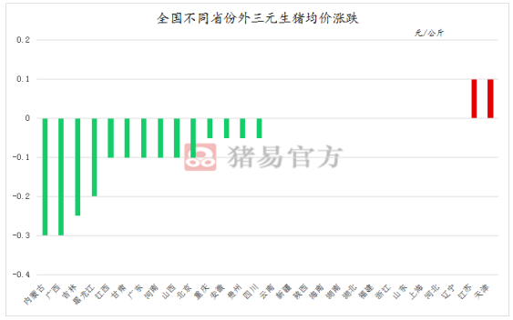 不同省份外三元来看,今日下跌地区增多,目前不仅北方猪价下跌,南方猪价局部也出现回调。其中内蒙古、广西猪价下跌幅度最大,为0.3元/公斤,吉林猪价下跌0.25元/公斤,黑龙江猪价下跌0.2元/公斤;江西、甘肃、广东、河南、山西、北京猪价小幅回调,下跌0.1元/公斤。