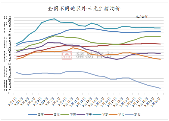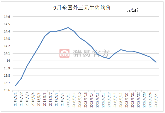 节日期间9月22—24日全国外三元生猪均价小幅下跌,节后,猪价下跌幅度加大。