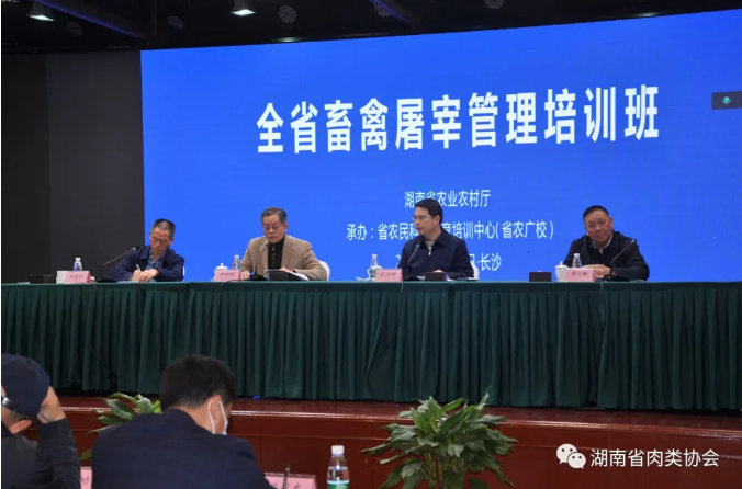 2021年12月21日,由湖南省农业农村厅主办,省农业广播电视学校和省肉类协会共同承办的全省畜禽屠宰企业管理培训班在长沙金源阳光酒店成功举办,全省122家A类畜禽屠宰企业负责人参加培训。