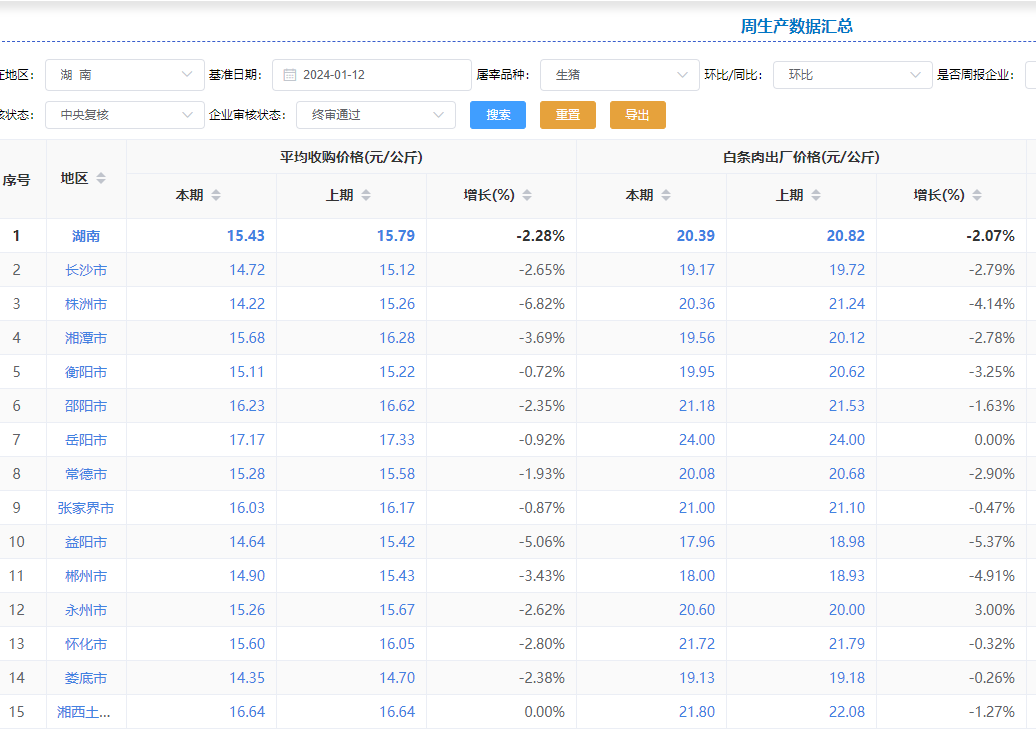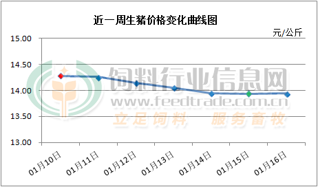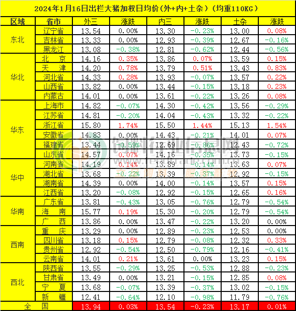 2024年1月16日,中国主流市场出栏外三元、内三元及土杂商品大猪加权日均价下跌,全国生猪出栏加权日均价13.82元每公斤,相比昨天下跌0.03%。