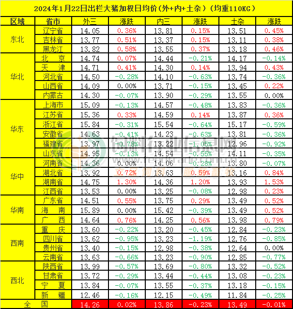 2024年1月22日,中国主流市场出栏外三元、内三元及土杂商品大猪加权日均价下跌,全国生猪出栏加权日均价14.15元每公斤,相比昨天下跌0.03%。