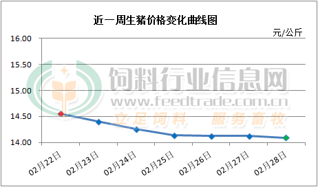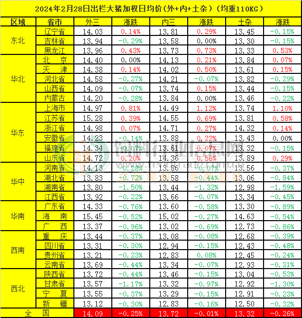 2024年2月28日,中国主流市场出栏外三元、内三元及土杂商品大猪加权日均价下跌,全国生猪出栏加权日均价13.98元每公斤,相比昨天下跌0.20%。
