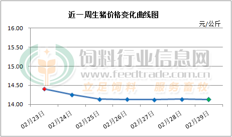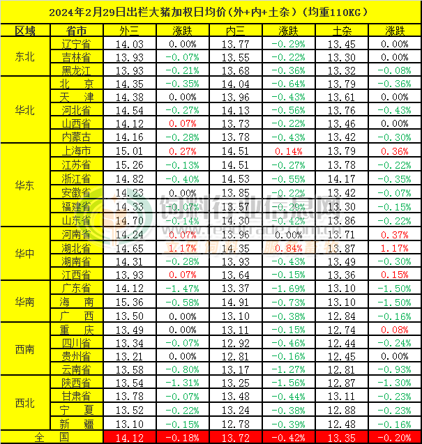 2024年2月29日,中国主流市场出栏外三元、内三元及土杂商品大猪加权日均价下跌,全国生猪出栏加权日均价14.01元每公斤,相比昨天下跌0.23%。