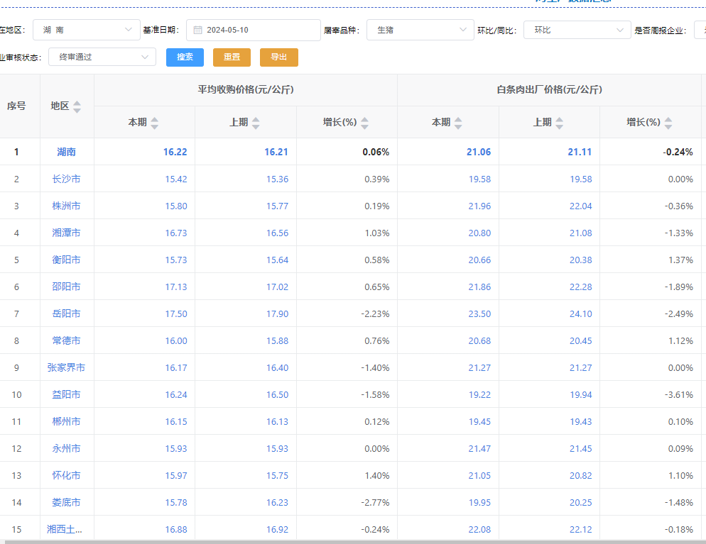 1. 主流市场外三元大猪全国销售均价15.21元每公斤,相比昨天上涨0.16%;
