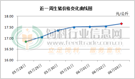 2024年6月3日,中国主流市场出栏外三元、内三元及土杂商品大猪加权日均价上涨,全国生猪出栏加权日均价17.55元每公斤,相比昨天上涨0.68%。