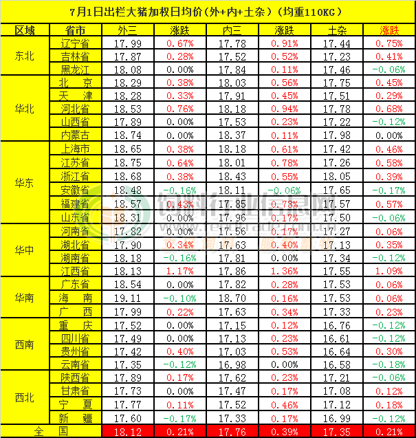 2024年7月1日,中国主流市场出栏外三元、内三元及土杂商品大猪加权日均价上涨,全国生猪出栏加权日均价18.02元每公斤,相比昨天上涨0.24%。