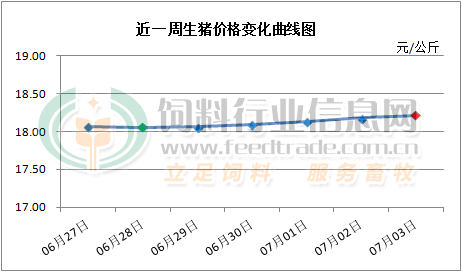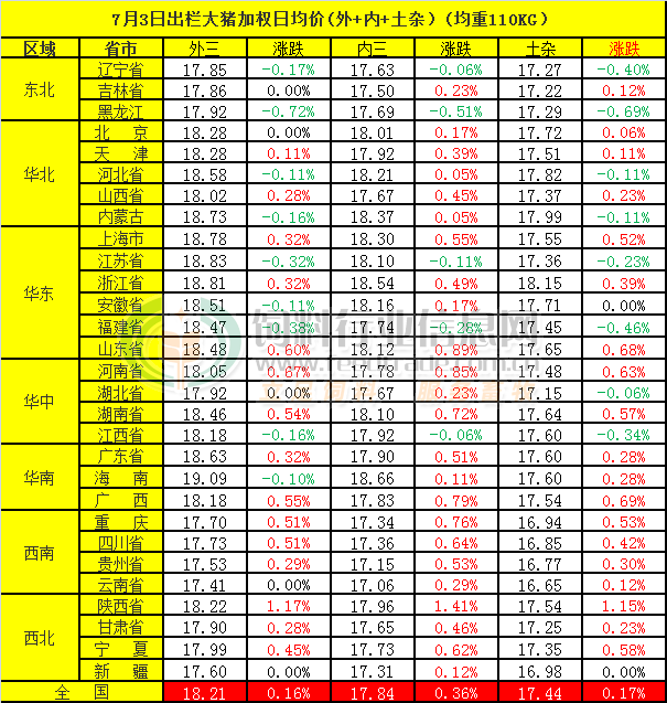 2024年7月3日,中国主流市场出栏外三元、内三元及土杂商品大猪加权日均价上涨,全国生猪出栏加权日均价18.10元每公斤,相比昨天上涨0.20%。